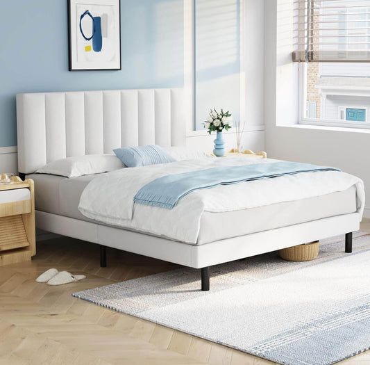 White Vegan Leather Vertical Tufted Platform Bed Frame